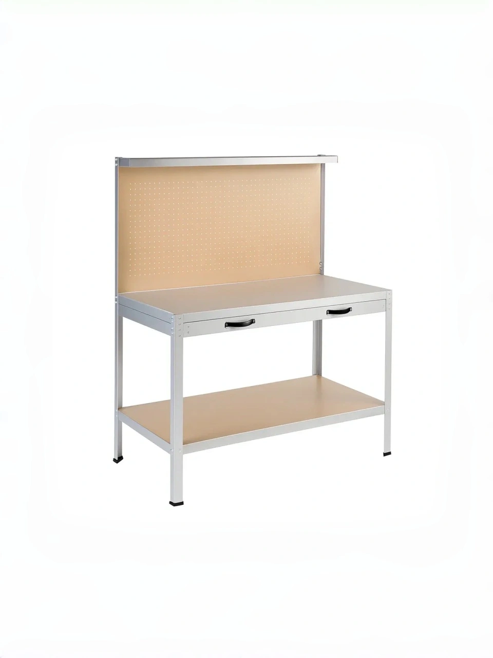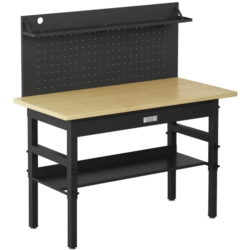 Cet établi en métal noir avec plateau en bois de 120x60x150 cm offre un espace de travail pratique et durable, idéal pour les ateliers et le bricolage